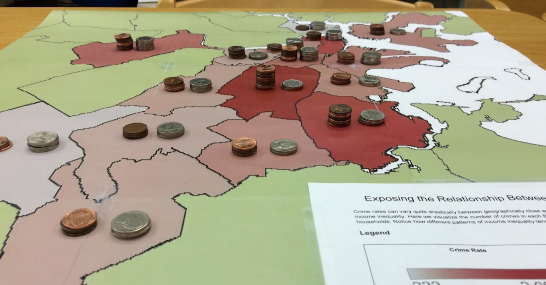 Arinze Okeke, Benjamin Reynolds and Christopher Rogers explored data sets about crime and income in Boston from the city’s open data portal and the US Census. They wanted to motivate people to think harder about income disparity and inform political debate to change policies to lower crime rates. Arinze, Ben and Chris created a novel map and data sculpture to use as a discussion piece in a real-world setting, stacking pennies to represent income rates on top of a printed heatmap of crime data.