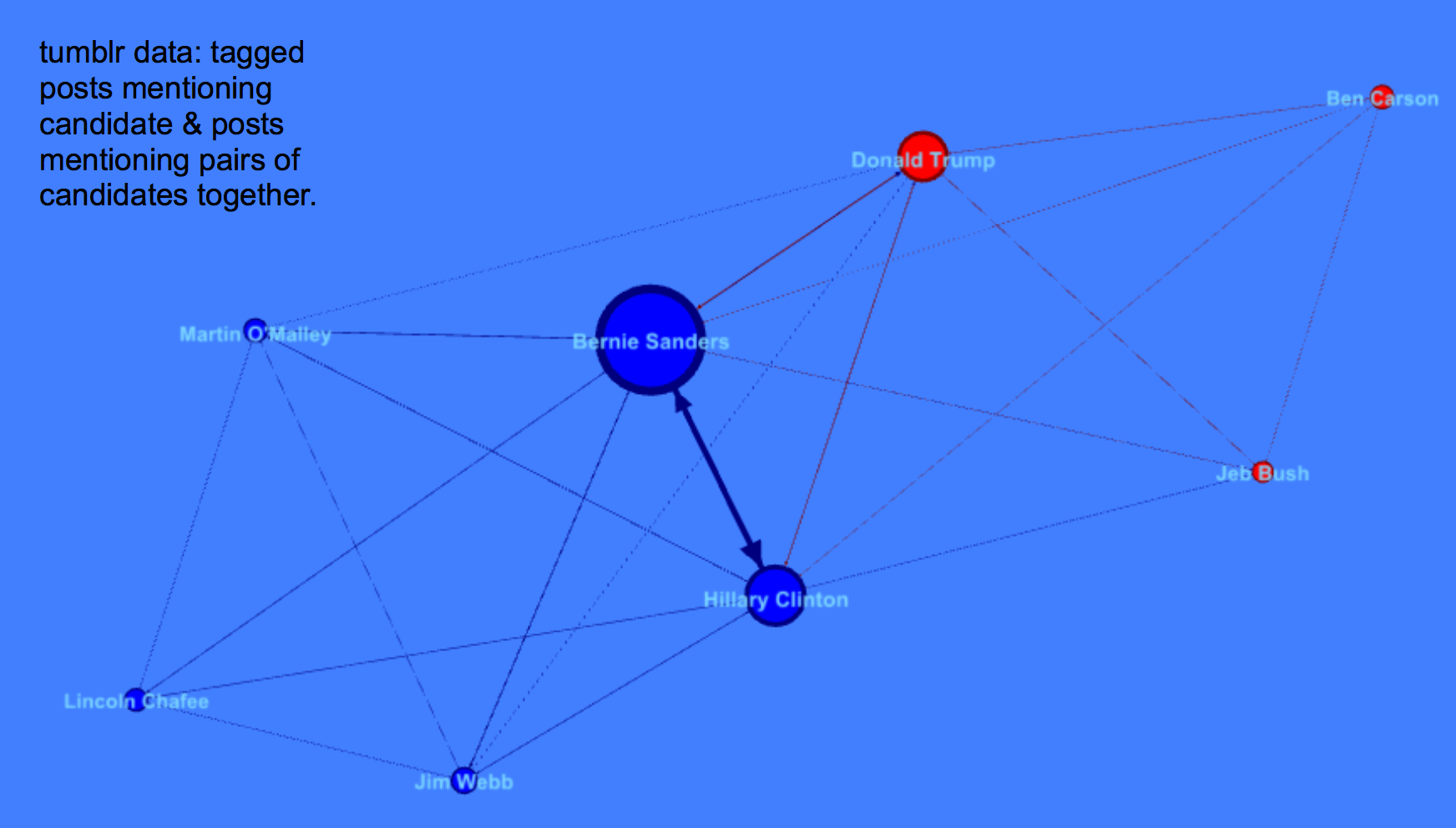 Alyssa Smith, Claire Zhang, and Karliegh Moore collected and analyzed Tumbler posts about the first 2015 Democratic presidential debate. They wanted to help campaigns understand how to use Tumblr as a social media platform, and delve into how tags are used as comments vs. classification. Alyssa, Claire and Karliegh found Bernie Sanders, Hillary Clinton, and Donald Trump were the most discussed, with a heavy negative light on Trump.