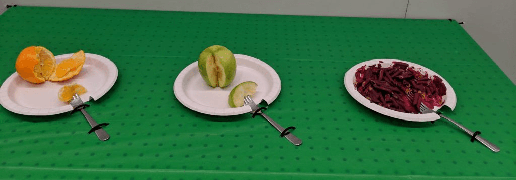 The hook is a long table with plates of food. Each plate has a fork with a bite-sized piece of food on it, such as a slice of apple. When you lift the fork, you realize it’s much heavier than a slice of apple should be. Upon being surprised and interested to learn more from the exhibit, you read the sign and realize that the weight you are lifting is the weight of the water used to produce that bite of food. For a slice of apple, that’s a full 27 pounds.