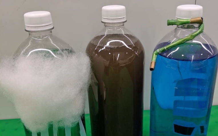 They expanded on this simple and surprising interaction by adding another sculpture that provides more detail. After lifting the forks and becoming engaged with the topic, viewers can walk to the next sculpture, which breaks down the types of water used in the production of an orange, to complement the total volume of water presented in the first sculpture. They use the familiar shape of 2-liter bottles to make a pyramid with colored water representing different types of water. This constructs another physical invitation, digging into the story of water along a different dimension.