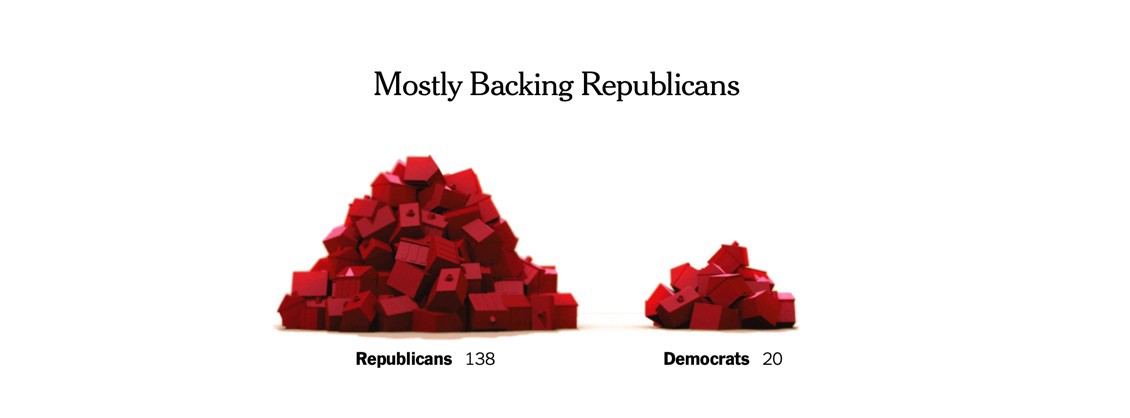 The article opens with a visual pun. They show a mocked up photo of a huge pile of green Monopoly houses blocking the White House, then quickly zoom in to a tiny pile of red Monopoly hotels on top (as the reader scrolls). The whole pile literally obscures the White House and the contrast between the number of red and green pieces instantly reveals the story arc (along with the text superimposed on top). This is playful, effective, and a good example of a data sculpture presented in 2D.