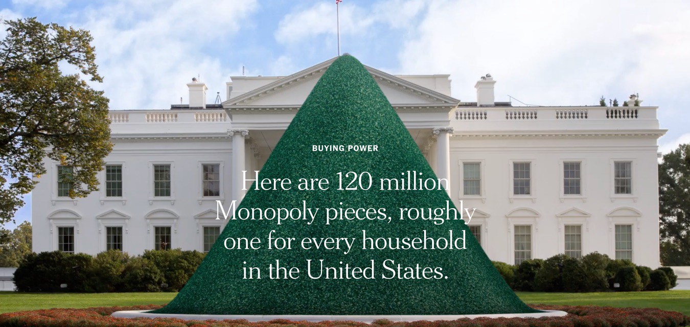 One of the few examples in print that I showcase often is an article published in the New York Times in 2016, entitled The Families Funding the 2016 Election. The narrative focuses on the small number of obscenely wealthy families that were responsible for most of the campaign donations. To tell this story they use the visual metaphor of houses and hotels from from the board game Monopoly; a symbol instantly recognizable to any American kid.