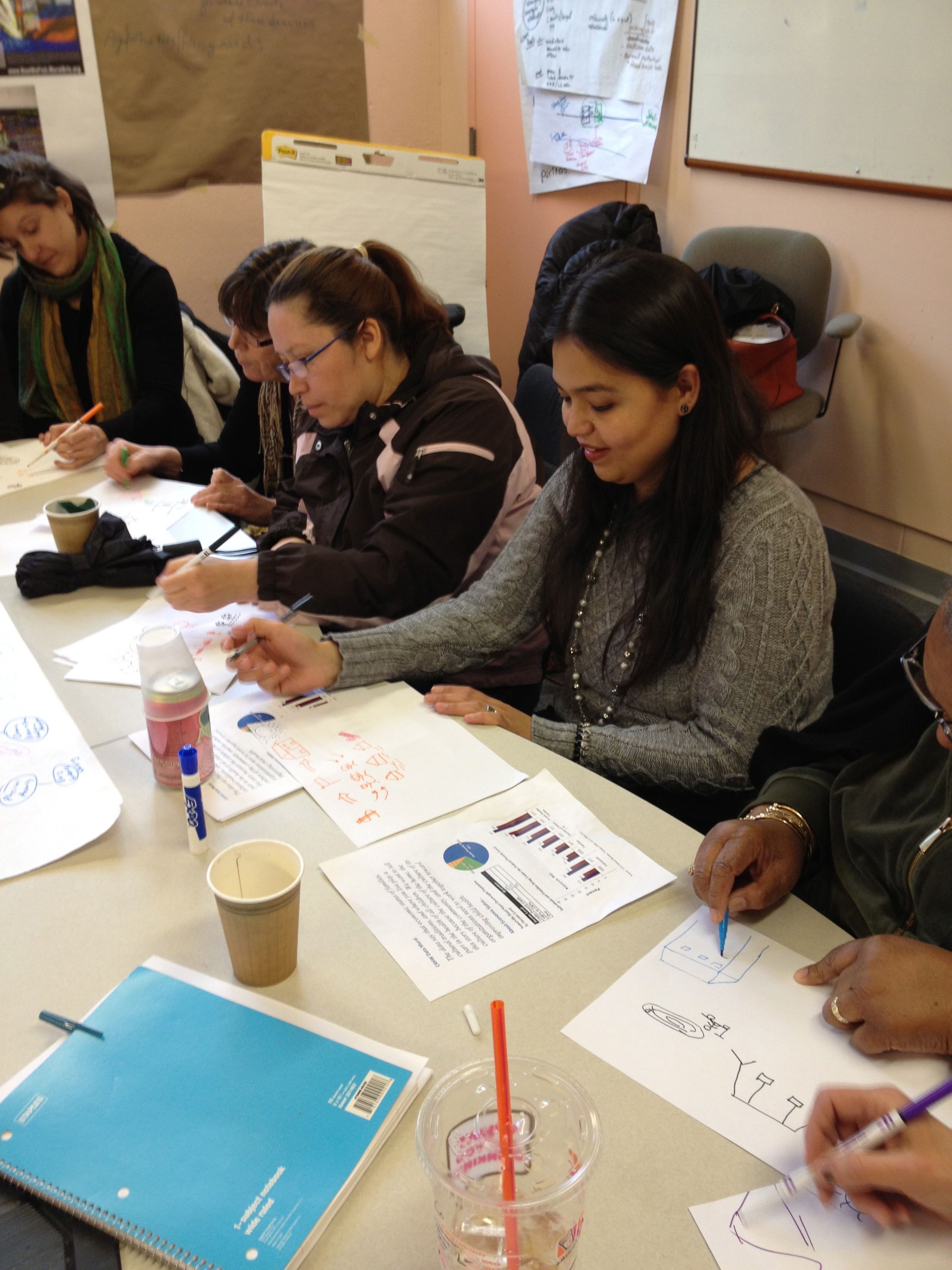 Our Data Mural process requires us to helps group create a collaborative visual design to tell their data-driven story. Unfortunately, most people are too nervous about their ability to engage in drawing out a story. This activity creates a structured format that puts helpful constraints around how much drawing each person does. It can also be hard to build shared ownership of a visual design. Focusing on the “we” rather than the “me” not only builds group cohesion, but also leads to more engagement in the design process. This activity helps create a sense of freedom in developing visuals, overcoming the feelings that “I can’t draw”. In addition, it builds a strong feeling of collaboration towards a shared ownership of a visual design. It also builds the ability to translate concepts into images.